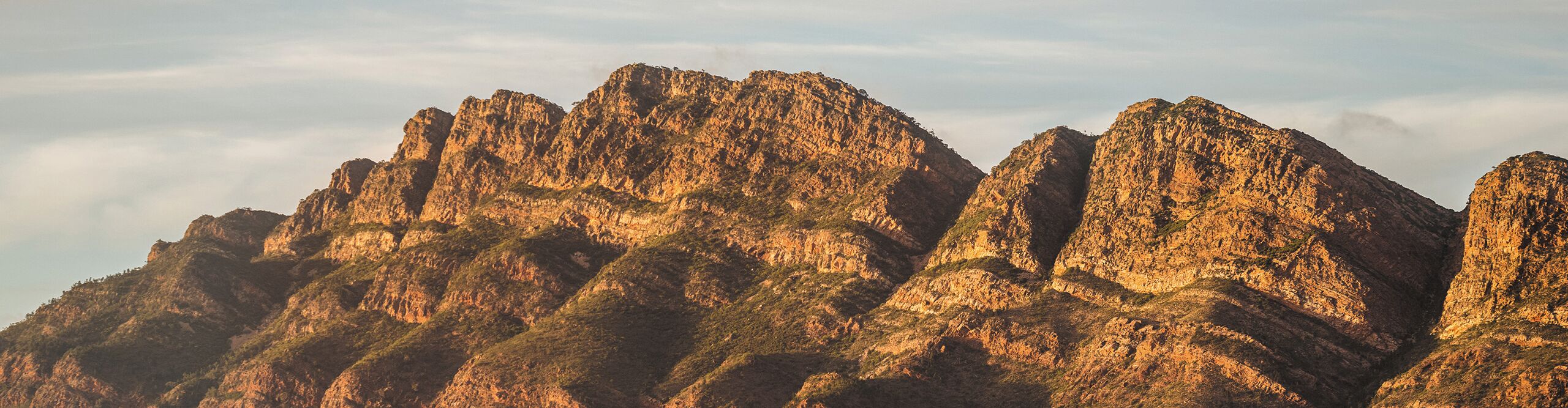 A wide shot of the Flinders Rangers in golden hour lighting