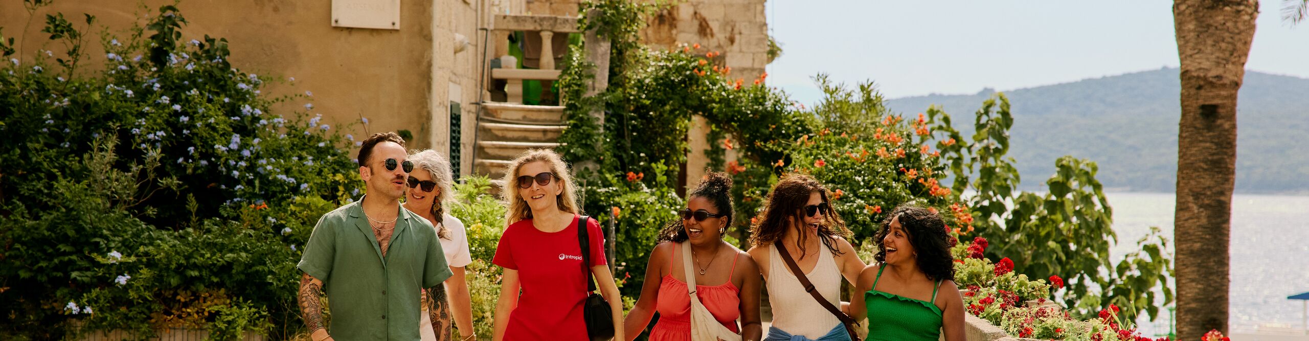 A group of travellers walks with an Intrepid leader through an old estate overlooking the water