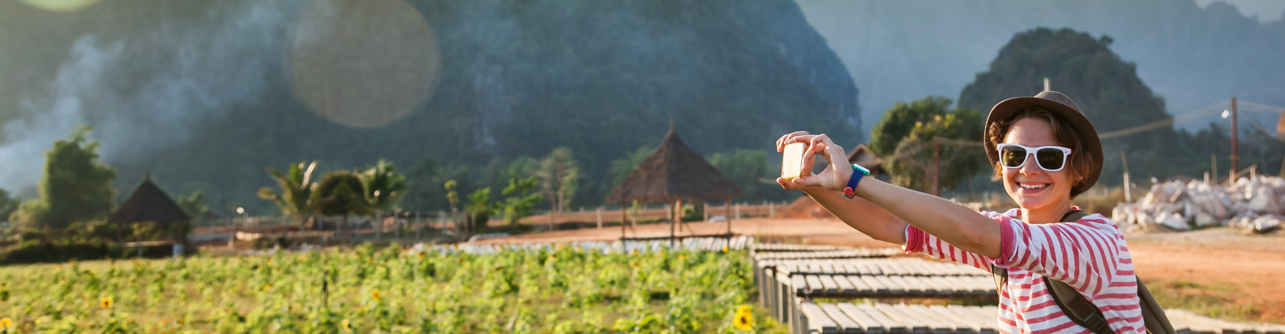 young woman photos on a mobile phone landscape in Laos, with mountains in the background