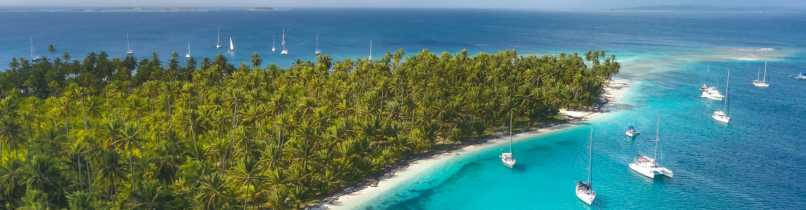 Aerial View of boats anchored in turquoise Water of Blue Lagoon next to white Sand Beach of San Blas